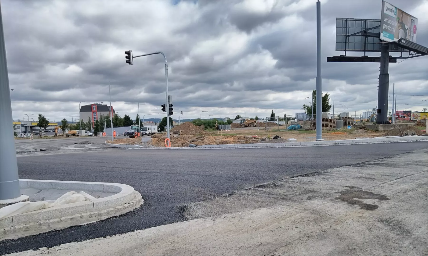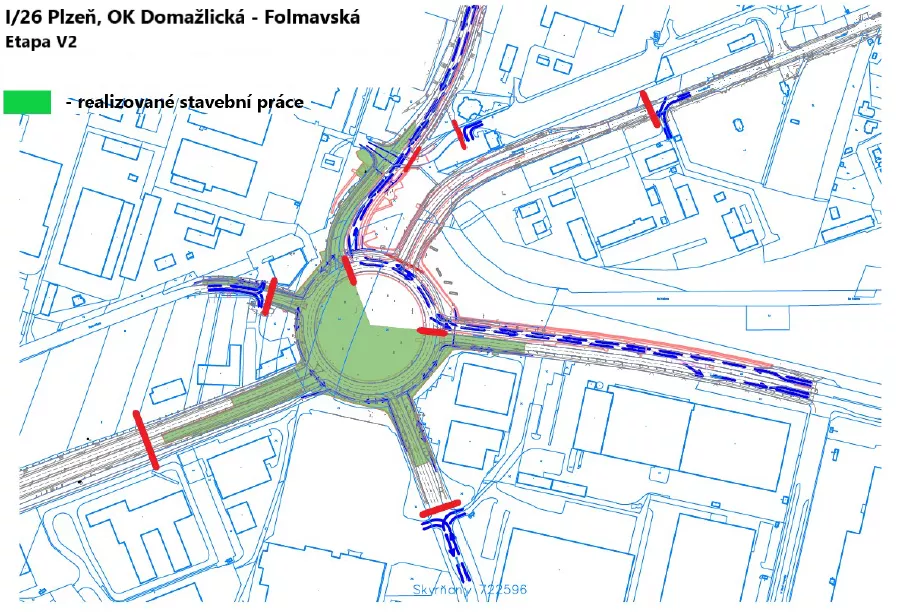Na uzavřených ramenech budou probíhat překopy pro pokládku inženýrských sítí, konstrukční vrstvy vozovky pro rozšíření ramen okružní křižovatky, osazovaní sloupů trakčního vedení a instalace sloupů a kabelového vedení pro budoucí řízení křižovatky světelnou signalizací.